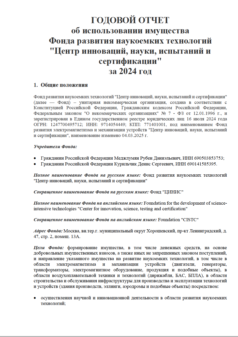 Фонд развития наукоемких технологий "Центр инноваций, науки, испытаний и сертификации" (далее — Фонд) – унитарная некоммерческая организация, создана в соответствии с Конституцией Российской Федерации, Гражданским кодексом Российской Федерации, Федеральным законом "О некоммерческих организациях" № 7 - ФЗ от 12.01.1996 г., и зарегистрирован в Едином государственном реестре юридических лиц 16 июля 2024 года ОГРН: 1247700495712; ИНН: 9714054449; КПП: 771401001, под наименованием Фонд развития электромагнетизма и механизации устройств "Центр инноваций, науки, испытаний и сертификации".
